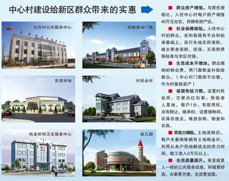 中心村以3公里为覆盖范围,规模5000人左右,不强制农民上楼,以群众自愿集聚,来源于刚性需求、空心村搬迁、土地整治等,按城市社区标准配套公共设施,并结合农民需求,配套村民会所、农贸市场、农具堆放点、老人菜地等。已开工2个城市安置区、5个中心村,共88栋,49.7万平米;年内还将开工2个中心村,21栋,4.8万平米。