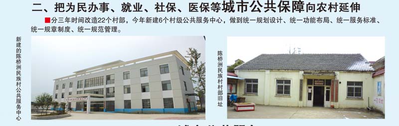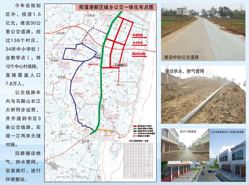 一、把公交、自来水、燃气、污水处理、电讯等城市基础设施向农村延伸。今年在规划区外,投资1.5亿元,建设30公里公交道路,经过136个村庄、34所中小学校(含教学点),将12个中心村连接,直接覆盖人口7.8万人。公交线路年内与马鞍山长江大桥同步运营,并开通到市区3条公交线路,实现一江两岸无缝对接。沿路铺设燃气、供水管网,安装路灯,进行环境整治。