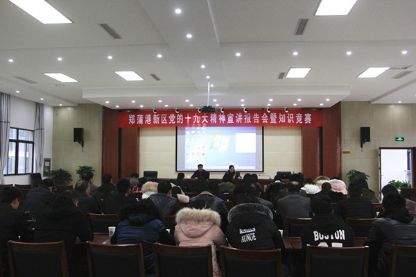 12月28日,郑蒲港新区开展了十九大精神宣讲会暨知识竞赛活动,宣讲会由新区党群工作部部长赵小丹主持,特邀市委党校萱萱教授宣讲。管委会机关全体工作人员,新区、两镇参加知识竞赛人员,市直驻派新区单位负责人;新区非公企业党支部负责人参加了本次宣讲。